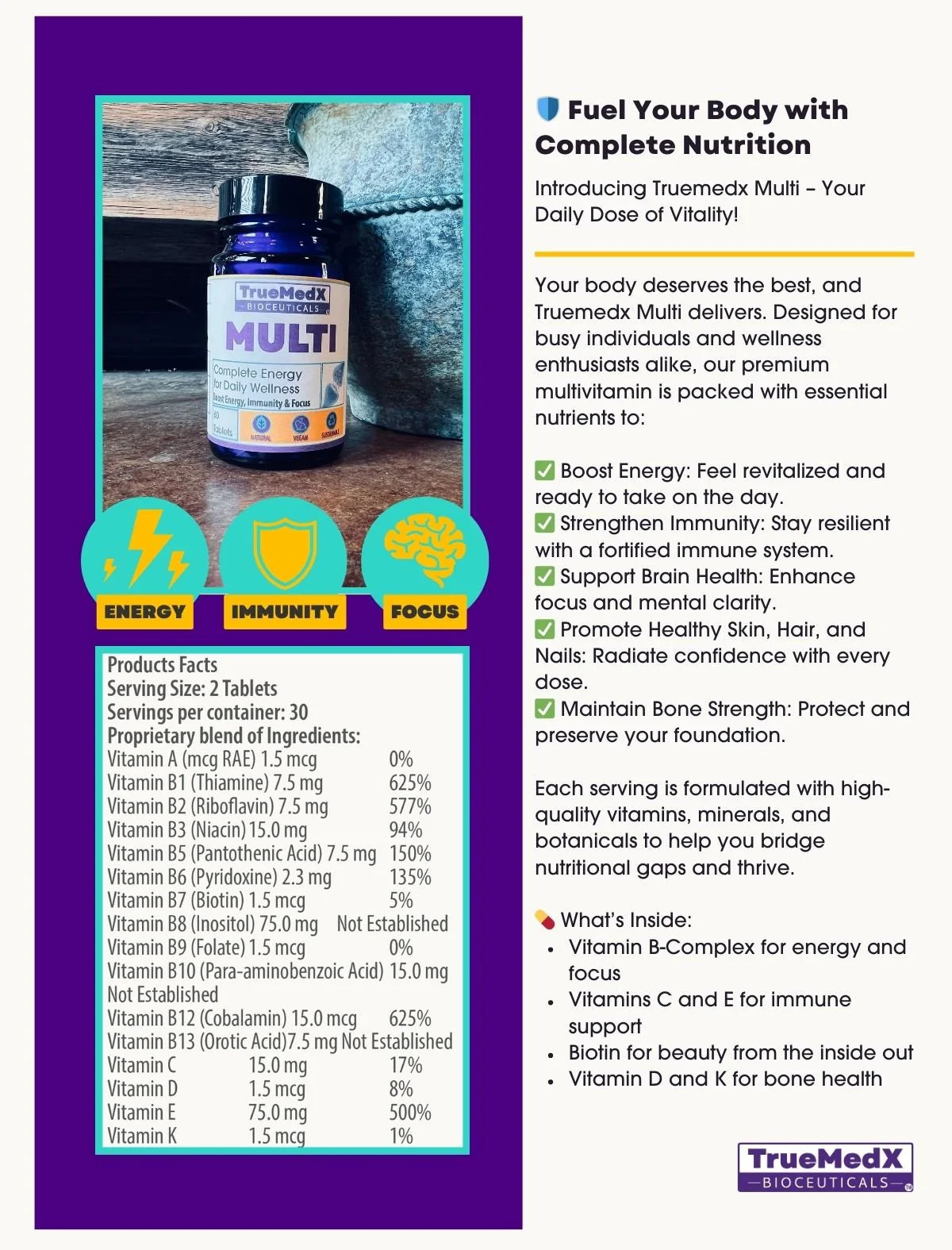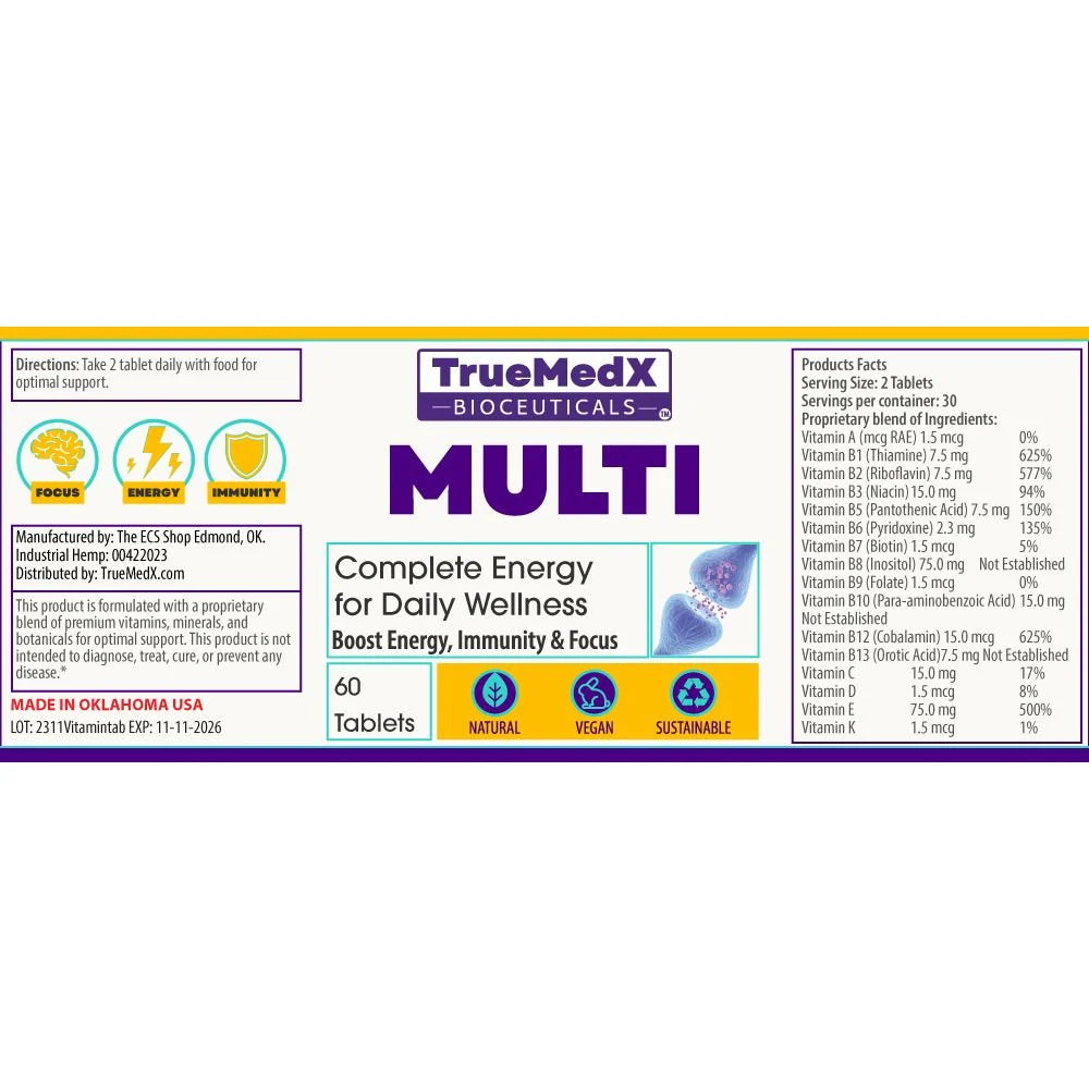 Elevate your wellness with Truemedx Multi, a premium multivitamin designed to support energy, immunity, and overall vitality. Packed with essential nutrients, including a powerful B-complex, Vitamins C, D, E, and K, and a proprietary blend of botanicals, this multivitamin is crafted for busy lifestyles and wellness enthusiasts. With benefits like enhanced focus, stronger immunity, and radiant skin, Truemedx Multi bridges nutritional gaps to help you feel your best every day.